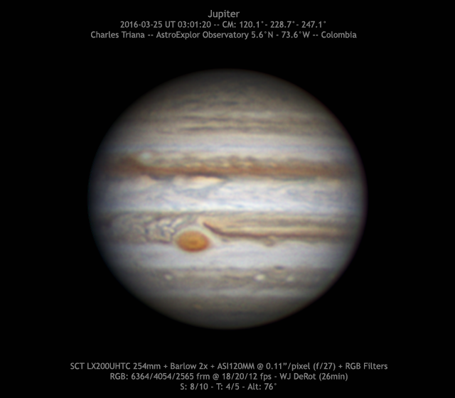 Here is an image of Jupiter in the night of 24-Mar-2016, obtained during an observation period of 26 minutes, under good seeing and good transparency. Near the central meridian the Great Red Spot (GRS) is observed, which presents a very intense red color, with an even redder center, and are observed atmospheric disturbances behind it (left). In addition, are observed some features within the GRS. Particularly interesting is the breakdown of the NEB toward the equatorial zone, north of the GRS. Ahead of the red spot are observed two spots of dark brown, on the southern edge of the SEB. Further south are observed the white ovals A2-A3-A4-A5, and is observed the new red spot in the SPB. In the northern hemisphere the NEB is darker than SEB. The WSZ is observed with quite brightness, on the northern edge of the NEB. Those two strips bluish are interesting in the NTropZ, which are located in slightly different latitudes or possible break.