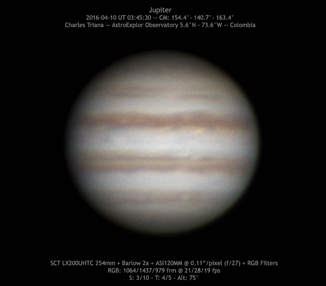 Jupiter 2016/04/10 UT 03:45:30 CM= 154.4° / 140.7° / 163.4° SCT LX200UHTC 254mm + Barlow 2x + RGB Filters + ASI120MM @ 0.11”/pixel (f/27) RGB: 1064/1437/979 frames @ 21/28/19 fps S: 3/10 – T: 4/5 – Alt: 75° Charles Triana - AstroExplor Observatory - Colombia