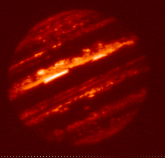5.10-micron filtered image of Jupiter taken by the staff of NASA's Infrared Telescope Facility (IRTF) using the guide camera of the SpeX facility infrared spectrometer as a part of a program to characterize atmospheric variability in Jupiter to support the Juno mission. This filter is sensitive to very little sunlight reflected from clouds, but mostly to thermal emission from clouds as deep or deeper than the 2-3 bar pressure level. In case of "duplicate" images, this is the final version.
