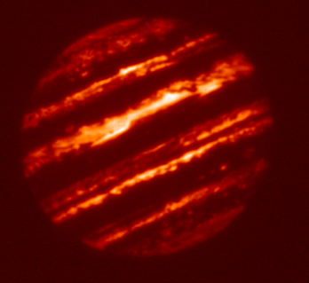 5.10-micron filtered image of Jupiter taken by the staff of NASA's Infrared Telescope Facility (IRTF) using the guide camera of the SpeX facility infrared spectrometer as a part of a program to characterize atmospheric variability in Jupiter to support the Juno mission. This filter is sensitive to very little sunlight reflected from clouds, but mostly to thermal emission from clouds as deep or deeper than the 2-3 bar pressure level. In case of "duplicate" images, this is the final version.