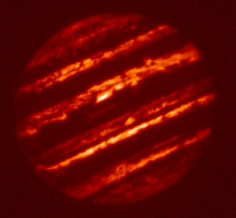 5.10-micron filtered image of Jupiter taken by the staff of NASA's Infrared Telescope Facility (IRTF) using the guide camera of the SpeX facility infrared spectrometer as a part of a program to characterize atmospheric variability in Jupiter to support the Juno mission. This filter is sensitive to very little sunlight reflected from clouds, but mostly to thermal emission from clouds as deep or deeper than the 2-3 bar pressure level. In case of "duplicate" images, this is the final version.