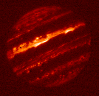 5.10-micron filtered image of Jupiter taken by the staff of NASA's Infrared Telescope Facility (IRTF) using the guide camera of the SpeX facility infrared spectrometer as a part of a program to characterize atmospheric variability in Jupiter to support the Juno mission. This filter is sensitive to very little sunlight reflected from clouds, but mostly to thermal emission from clouds as deep or deeper than the 2-3 bar pressure level. In case of "duplicate" images, this is the final version.