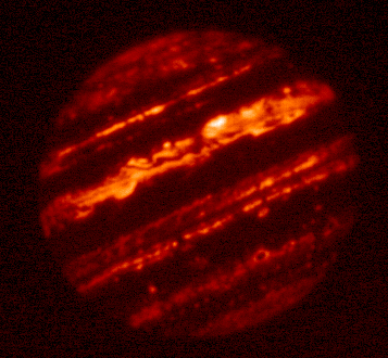 5.10-micron filtered image of Jupiter taken by the staff of NASA's Infrared Telescope Facility (IRTF) using the guide camera of the SpeX facility infrared spectrometer as a part of a program to characterize atmospheric variability in Jupiter to support the Juno mission. This filter is sensitive to very little sunlight reflected from clouds, but mostly to thermal emission from clouds as deep or deeper than the 2-3 bar pressure level. In case of "duplicate" images, this is the final version.
