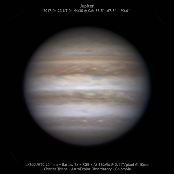 This is a RGB image of Jupiter on 23-Apr-2017. In this image we can see the ovals AWO: A6, A7, A8, A1 and the STB ghost. In the north border of the SEB we can see a yellowish-green color. Charles Triana - AstroExplor Observatory - Colombia
