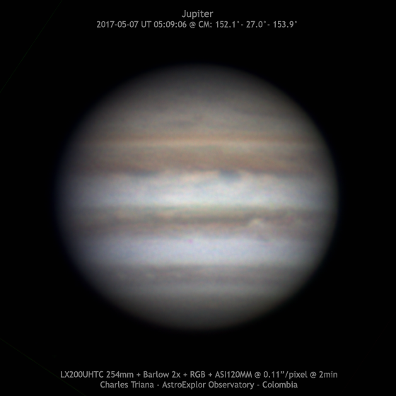 Jupiter 2017/05/07 UT 05:09:06 CM= 152.1°/ 27.0°/ 153.9° SCT LX200UHTC 254mm + Barlow 2x + RGB Filters + ASI120MM @ 0.11”/pixel (f/29) RGB: 1345/1352/953 frames @ 33/33/23 fps @ 2min S: 4/10 – T: 3/5 – Alt: 55° Charles Triana - AstroExplor Observatory - Colombia