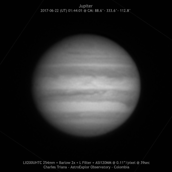 Jupiter 2017/06/22 (UT) 01:44:01 CM= 88.6°/ 333.6°/ 112.8° SCT LX200UHTC 254mm + Barlow 2x + L Filter + ASI120MM @ 0.11”/pixel (f/29) L: 1332 frames @ 34 fps @ 39sec S: 5/10 – T: 4/5 – Alt: 59° Charles Triana - AstroExplor Observatory - Colombia