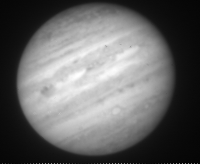 1.58-micron ("methane-short" filter) observation of Jupiter taken by the staff of NASA's Infrared Telescope Facility (IRTF) using the guide camera of the SpeX facility infrared spectrometer as a part of a program to characterize atmospheric variability in the atmosphere to support the Juno mission.