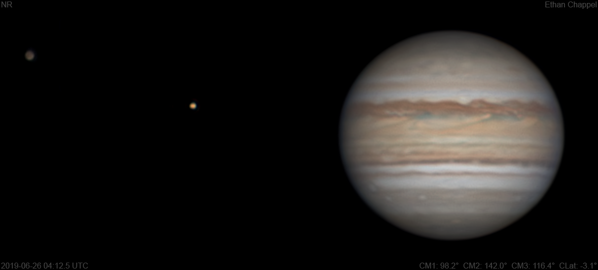Another night where the weather was more generous than the forecast suggested. Notes: The southern South Equatorial Belt is very dark. Oval BA is rising. The faint streak in the South Temperate I noted on an image from June 2 is at the central meridian. The South Polar Red Spot is just east of the central meridian. Io and Ganymede are approaching transit.