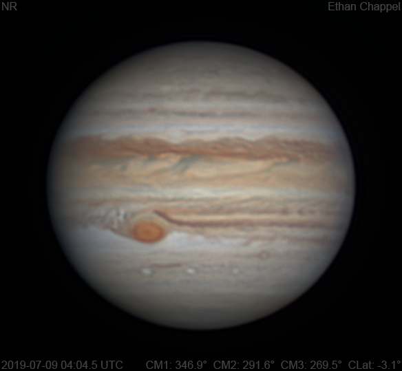 The third night of excellent planetary imaging, but also the third night of breezy conditions too intense for the CGEM DX and C14, so this is another session using the C8. Notes: White Oval Z is approaching the central meridian. The EZ, except the southern edge, is orange. The Great Red Spot has a small flake on its western edge. Two green-ish SEB rings are approaching the GRS from the east, carrying with them the potential for more flakes. The STB contains a small white oval with a dark boundary.