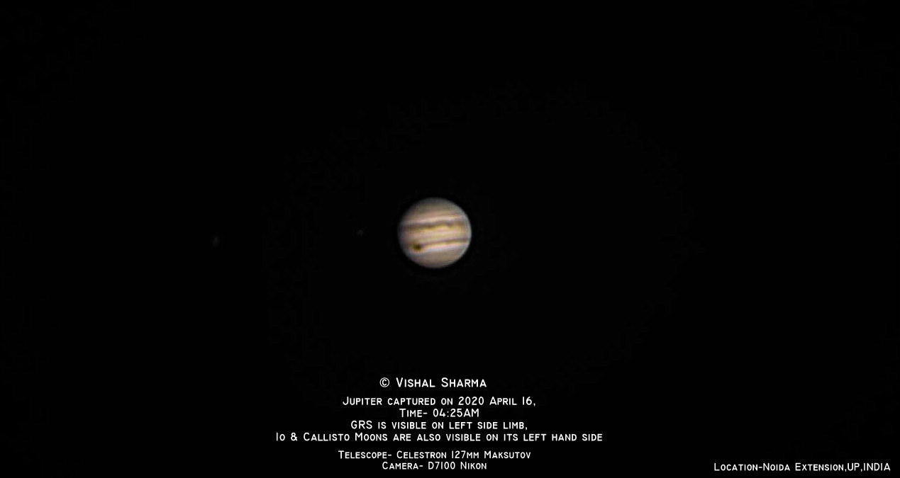 Captured Jupiter with famous Great Red Spot and two of its Galilean moons on 2020-04-16 at 04:25 am, Ajnara Le Garden, Noida Extension, UP, India.