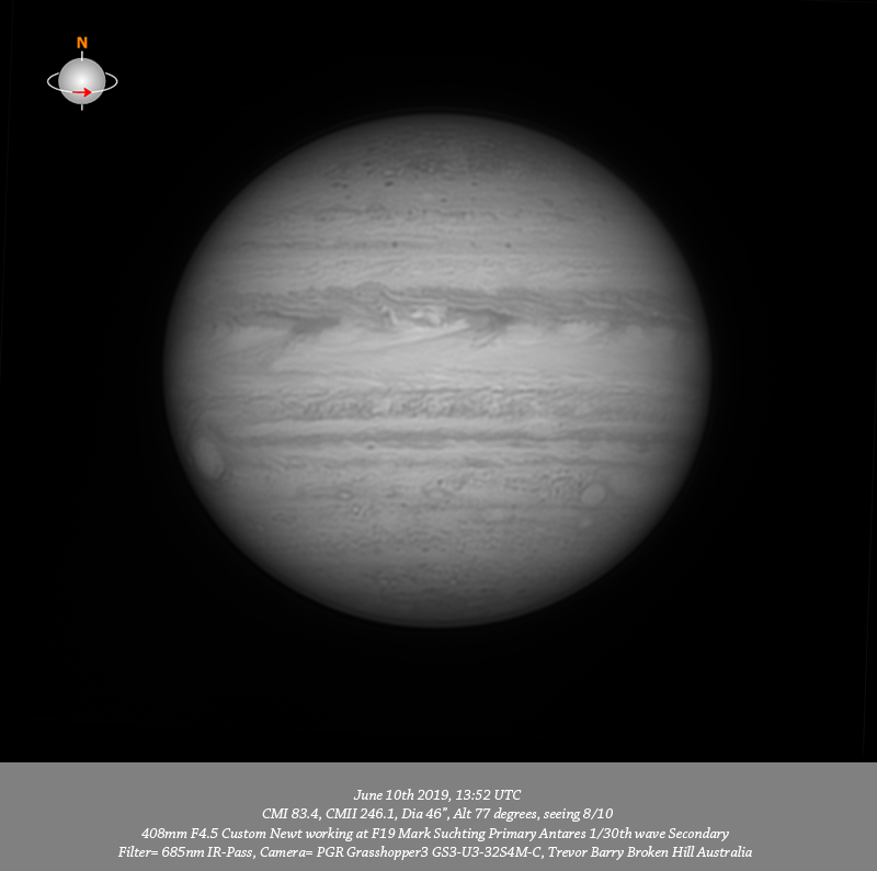 685nm-Pass IR data. Jupiter at opposition. Very hi-res particularly down the down stream structure from the material ejected from the eye of the GRS.
