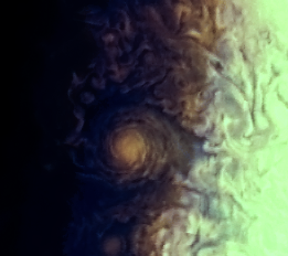 Storm on southern hemisphere on Jupiter, color enhanced to show detail. Wish I had a higher res image to start with!
