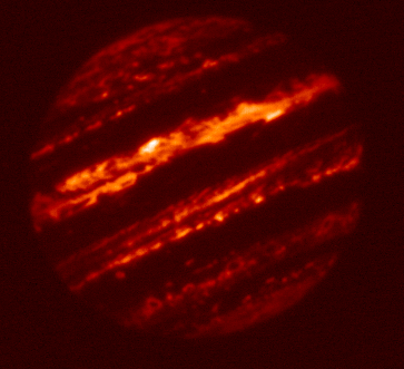 5.10-micron filtered image of Jupiter taken by the staff of NASA's Infrared Telescope Facility (IRTF) using the guide camera of the SpeX facility infrared spectrometer as a part of a program to characterize atmospheric variability in Jupiter to support the Juno mission. This filter is sensitive to very little sunlight reflected from clouds, but mostly to thermal emission from clouds as deep or deeper than the 2-3 bar pressure level.
