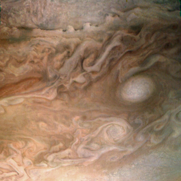Image rotated and cropped. Color corrected for approximate natural colors. Cyclonic storms in southern belt.
