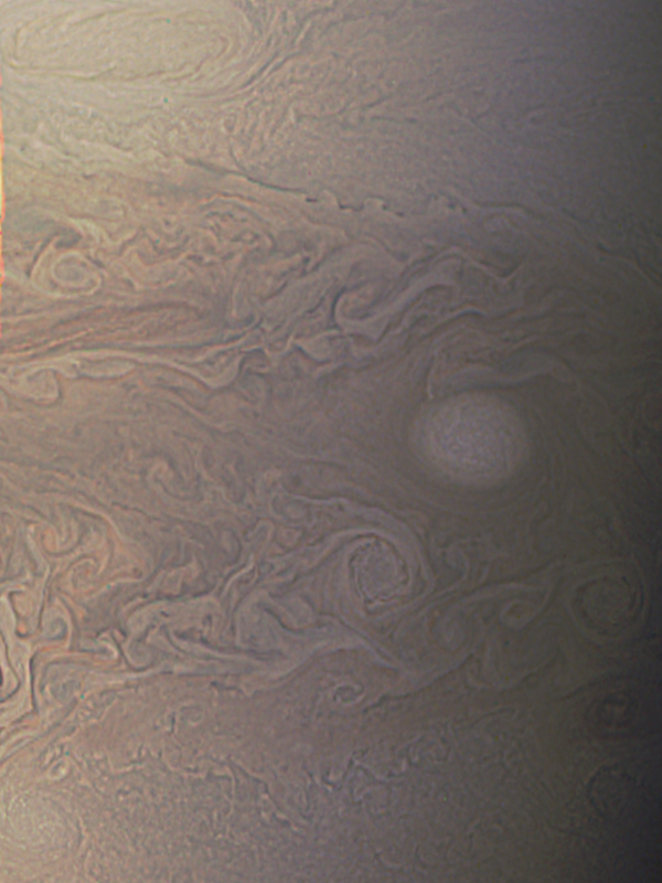 Junocam pixels are 12 bits deep from the camera but are converted to 8 bits inside the instrument using a lossless "companding" table, a process similar to gamma correction, to reduce their size. All Junocam products on the missionjuno website are in this 8-bit form as received on Earth. Scientific users interested in radiometric analysis should use the "RDR" data products archived with the Planetary Data System, which have been converted back to a linear 12-bit scale.
