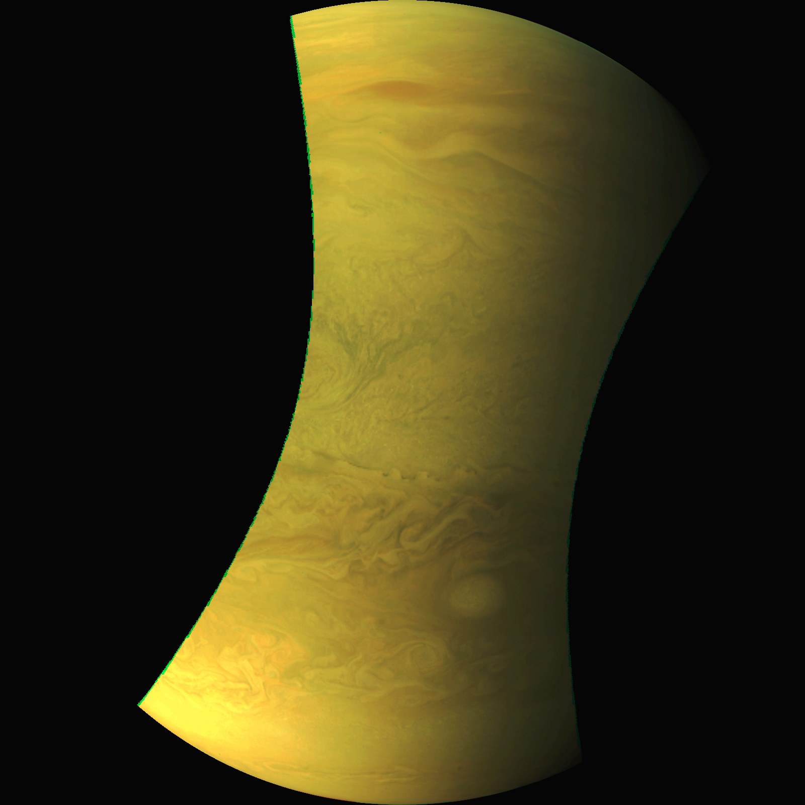 Junocam pixels are 12 bits deep from the camera but are converted to 8 bits inside the instrument using a lossless "companding" table, a process similar to gamma correction, to reduce their size. All Junocam products on the missionjuno website are in this 8-bit form as received on Earth. Scientific users interested in radiometric analysis should use the "RDR" data products archived with the Planetary Data System, which have been converted back to a linear 12-bit scale.