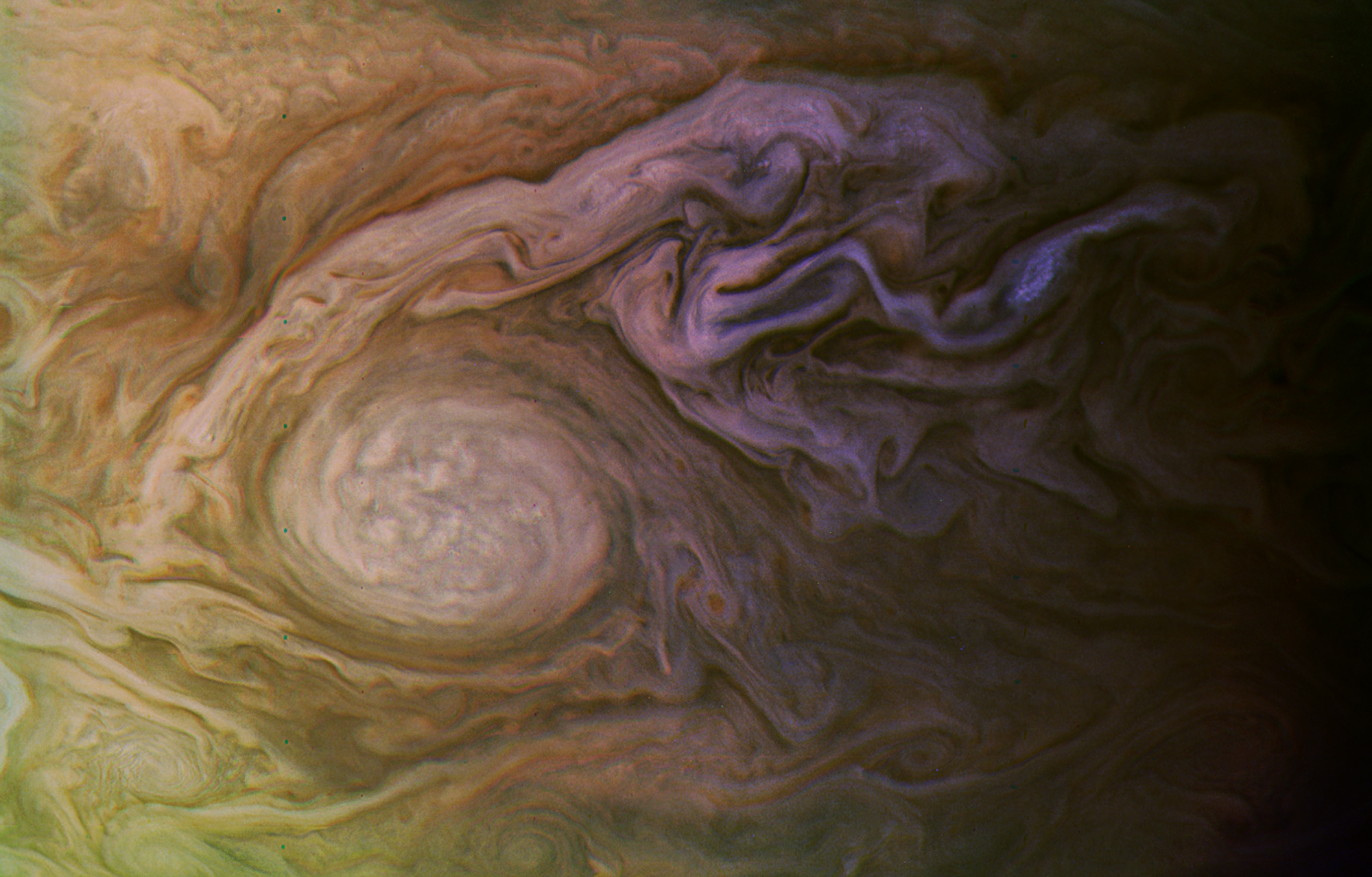 Junocam pixels are 12 bits deep from the camera but are converted to 8 bits inside the instrument using a lossless "companding" table, a process similar to gamma correction, to reduce their size. All Junocam products on the missionjuno website are in this 8-bit form as received on Earth. Scientific users interested in radiometric analysis should use the "RDR" data products archived with the Planetary Data System, which have been converted back to a linear 12-bit scale.