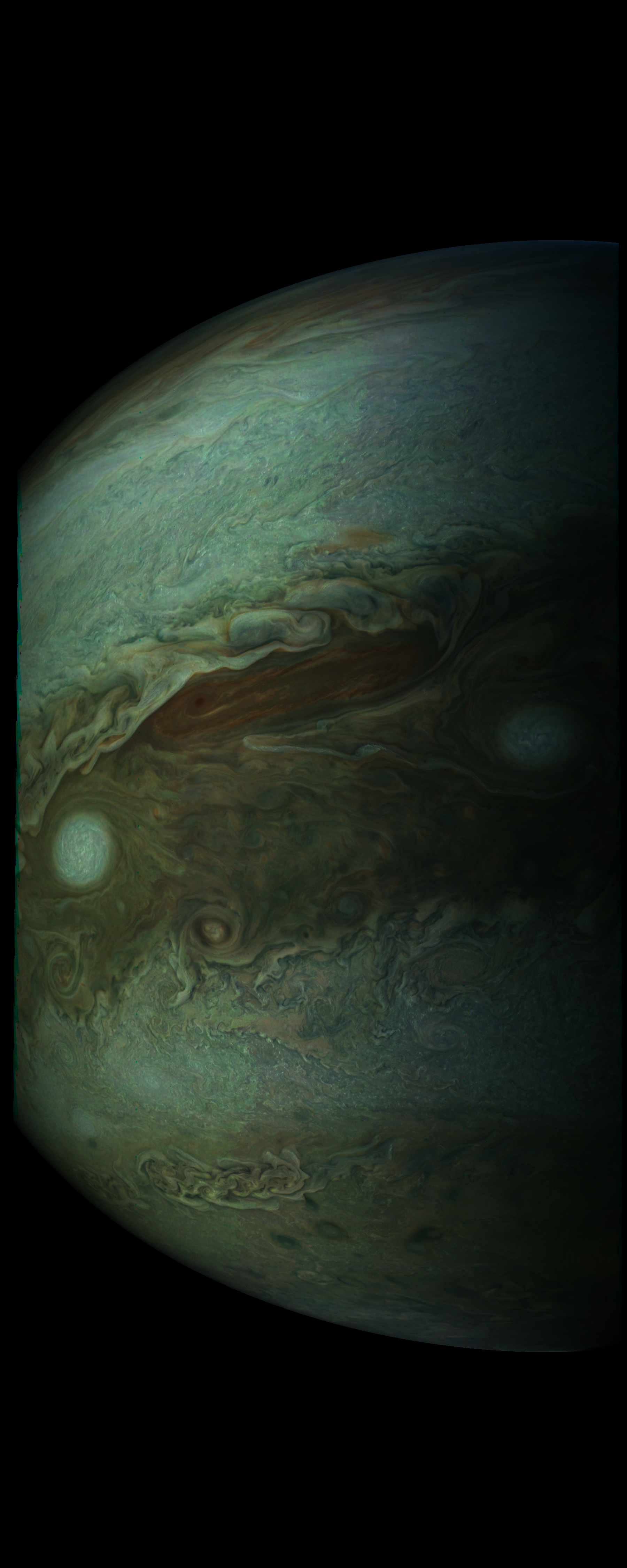 The image is rendered directly from the raw image. Resolution is 30 pixels per degree in a spherical coordinate system, as seen from JunoCam at image stop time.