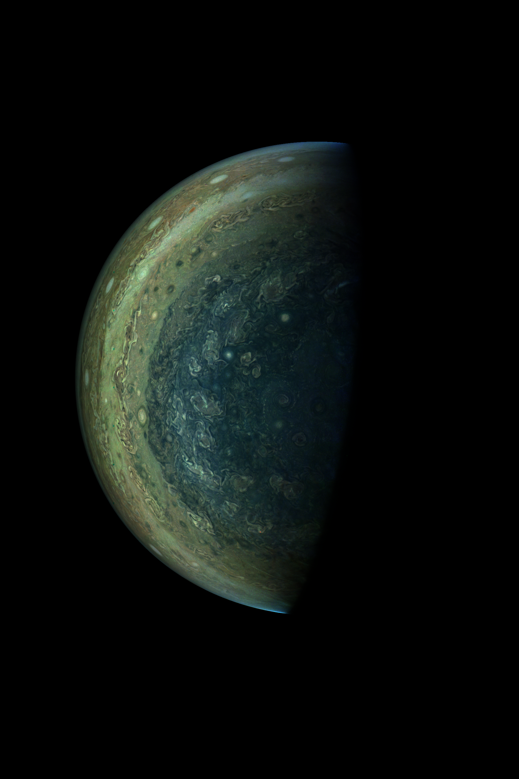 The image is rendered directly from the raw image. Resolution is 30 pixels per degree in a spherical coordinate system, as seen from JunoCam at image stop time.