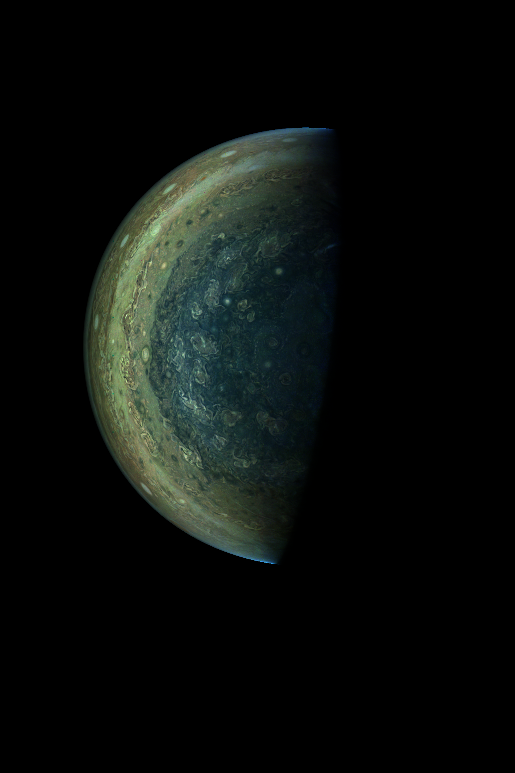 The image is rendered directly from the raw image. Resolution is 30 pixels per degree in a spherical coordinate system, as seen from JunoCam at image stop time.