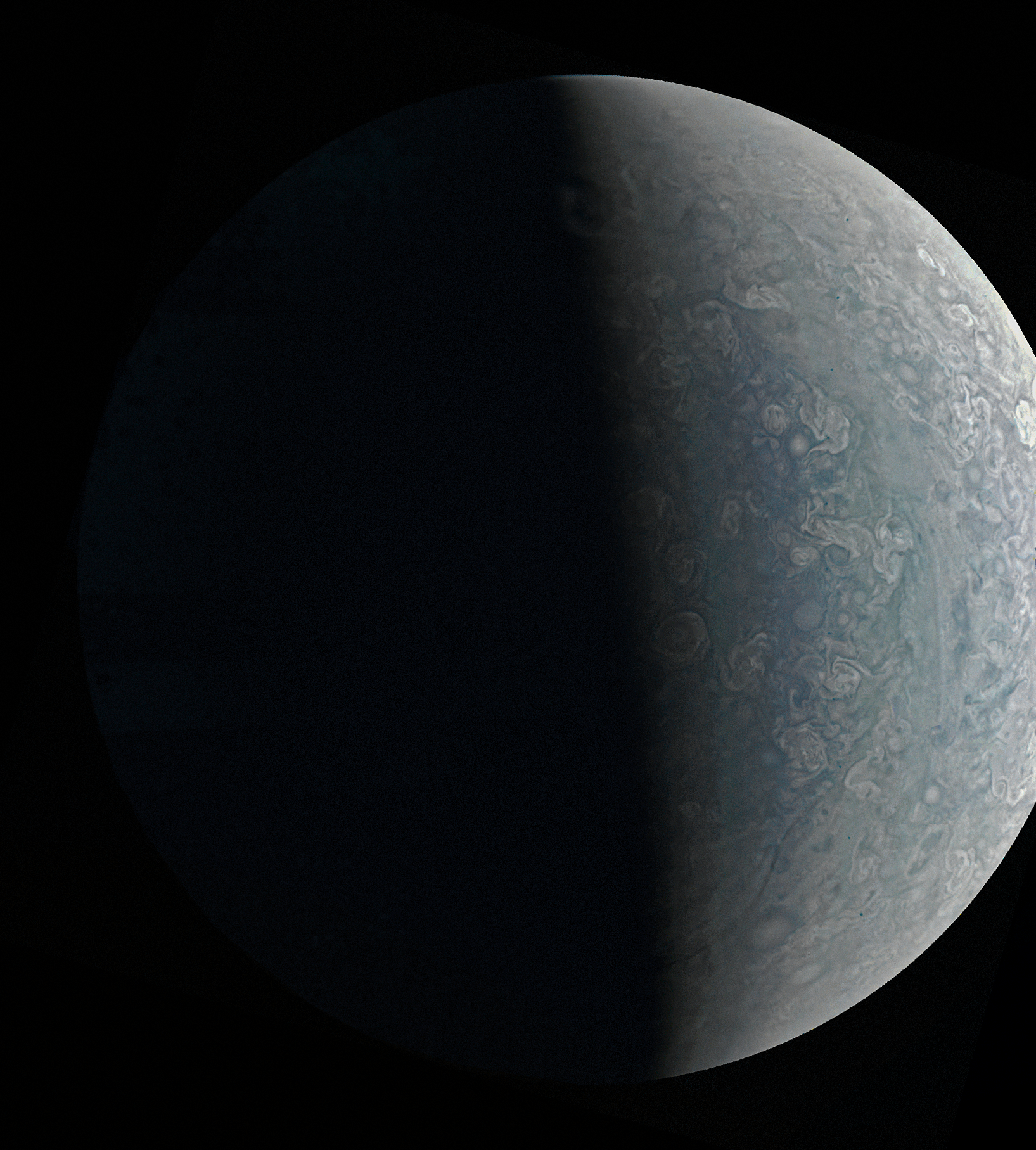 Alternative version of Jupiter's north pole, processed assembled CMYK red, green and blue filters to maximize the details.