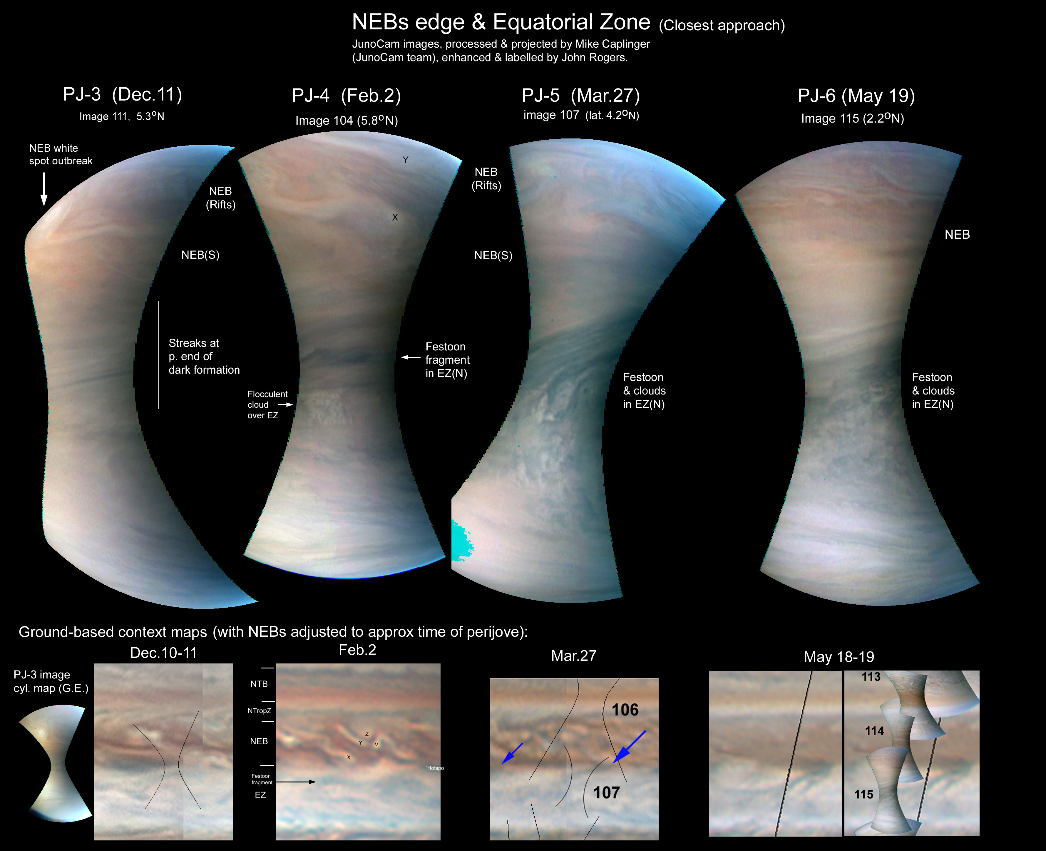 These were the closest-range images, until perijoves shifted further north. None of them have yet caught a NEBs dark formation (‘hot spot’); instead, all have caught festoons or similar dark blue-grey streaks just preceding (PJ3), between (PJ4), or following (PJ5 & PJ6) hot spots. Further description is at: https://britastro.org/node/10478. –John Rogers.