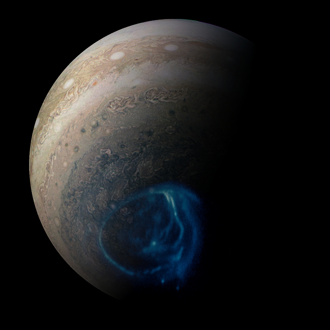 Combined an image of Jupiter's polar region (JunoCam) with a high ultraviolet image of the planet's aurora (HST - STIS).