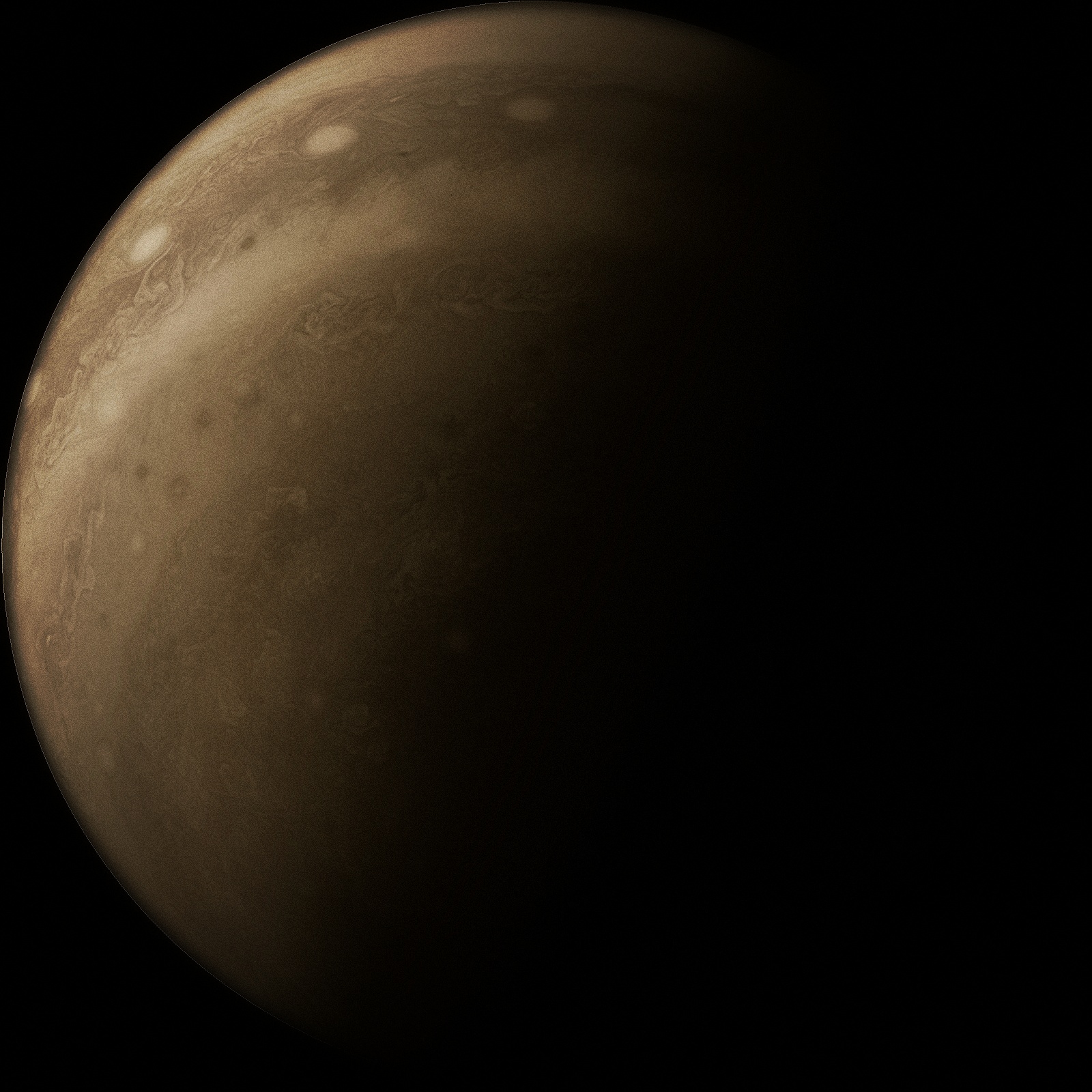 Junocam pixels are 12 bits deep from the camera but are converted to 8 bits inside the instrument using a lossless "companding" table, a process similar to gamma correction, to reduce their size. All Junocam products on the missionjuno website are in this 8-bit form as received on Earth. Scientific users interested in radiometric analysis should use the "RDR" data products archived with the Planetary Data System, which have been converted back to a linear 12-bit scale.