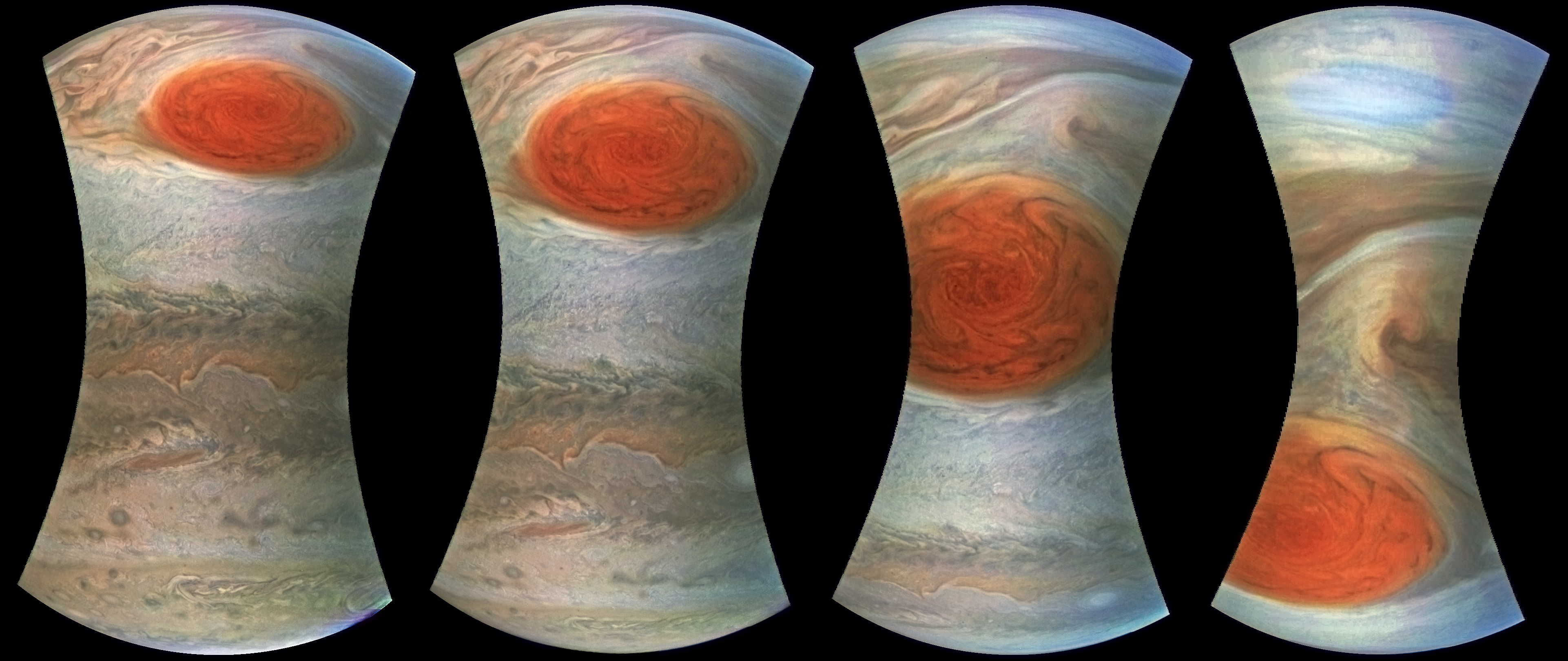 These are enhanced, filtered, and color adjusted versions of the great red spot images in sequential order showing the changing view from the spacecraft as it passed over the Great Red Spot
