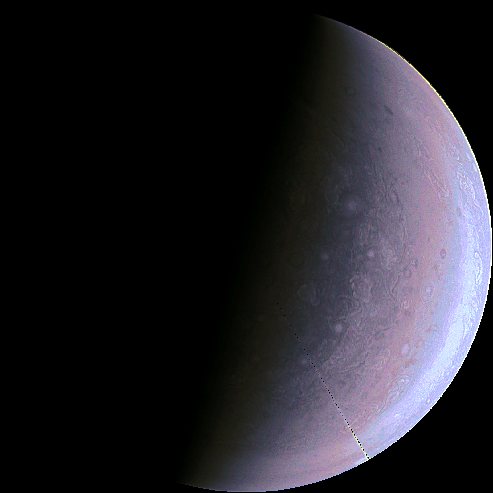Junocam pixels are 12 bits deep from the camera but are converted to 8 bits inside the instrument using a lossless "companding" table, a process similar to gamma correction, to reduce their size. All Junocam products on the missionjuno website are in this 8-bit form as received on Earth. Scientific users interested in radiometric analysis should use the "RDR" data products archived with the Planetary Data System, which have been converted back to a linear 12-bit scale.