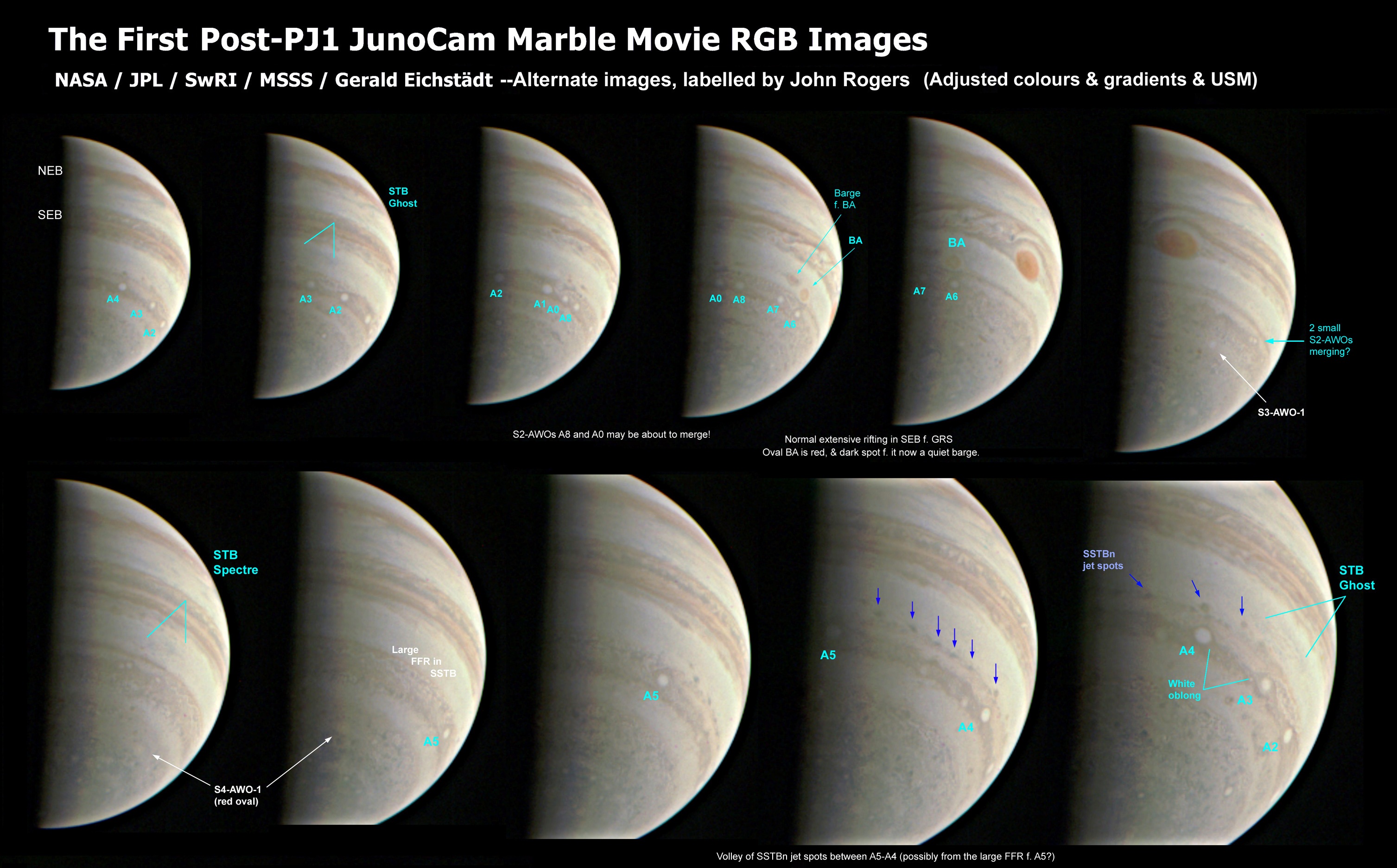 This is the second of two postings of JunoCam's 'marble movie' images, using versions initially processed by Gerald Eichstädt, which are here further enhanced and labelled to identify the features which we were following in amateur images. This set shows the southern hemisphere for a whole rotation in the day after perijove-1 (Aug.27). The most notable change is described at the end of this text: two long-lived white ovals appear likely to merge.
