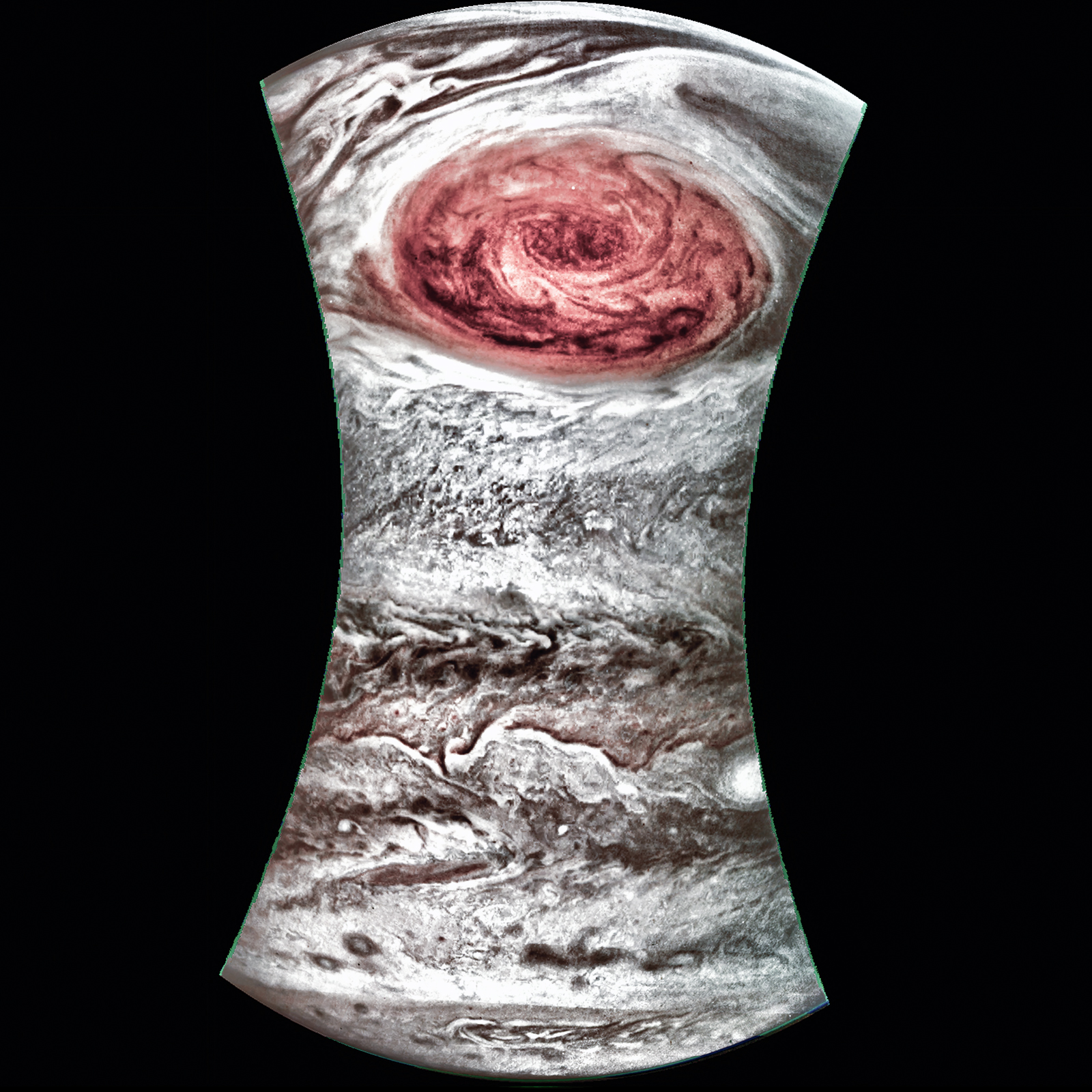 Junocam pixels are 12 bits deep from the camera but are converted to 8 bits inside the instrument using a lossless "companding" table, a process similar to gamma correction, to reduce their size. All Junocam products on the missionjuno website are in this 8-bit form as received on Earth. Scientific users interested in radiometric analysis should use the "RDR" data products archived with the Planetary Data System, which have been converted back to a linear 12-bit scale.
