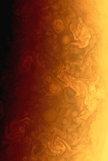 Junocam pixels are 12 bits deep from the camera but are converted to 8 bits inside the instrument using a lossless "companding" table, a process similar to gamma correction, to reduce their size. All Junocam products on the missionjuno website are in this 8-bit form as received on Earth. Scientific users interested in radiometric analysis should use the "RDR" data products archived with the Planetary Data System, which have been converted back to a linear 12-bit scale.