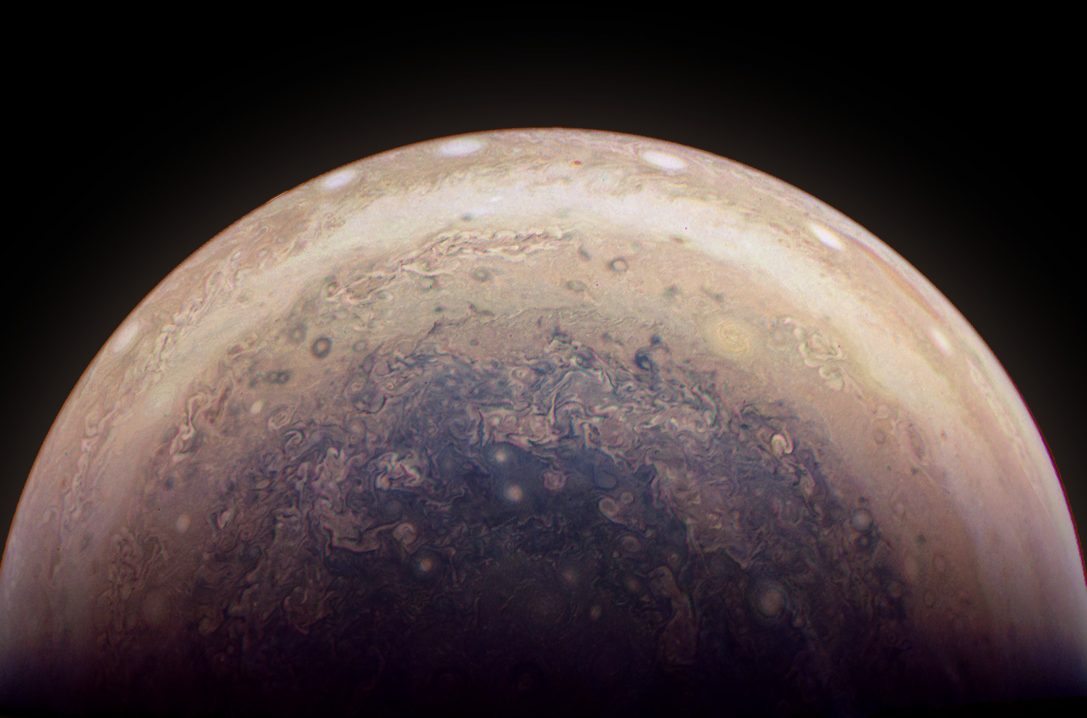 Junocam pixels are 12 bits deep from the camera but are converted to 8 bits inside the instrument using a lossless "companding" table, a process similar to gamma correction, to reduce their size. All Junocam products on the missionjuno website are in this 8-bit form as received on Earth. Scientific users interested in radiometric analysis should use the "RDR" data products archived with the Planetary Data System, which have been converted back to a linear 12-bit scale.