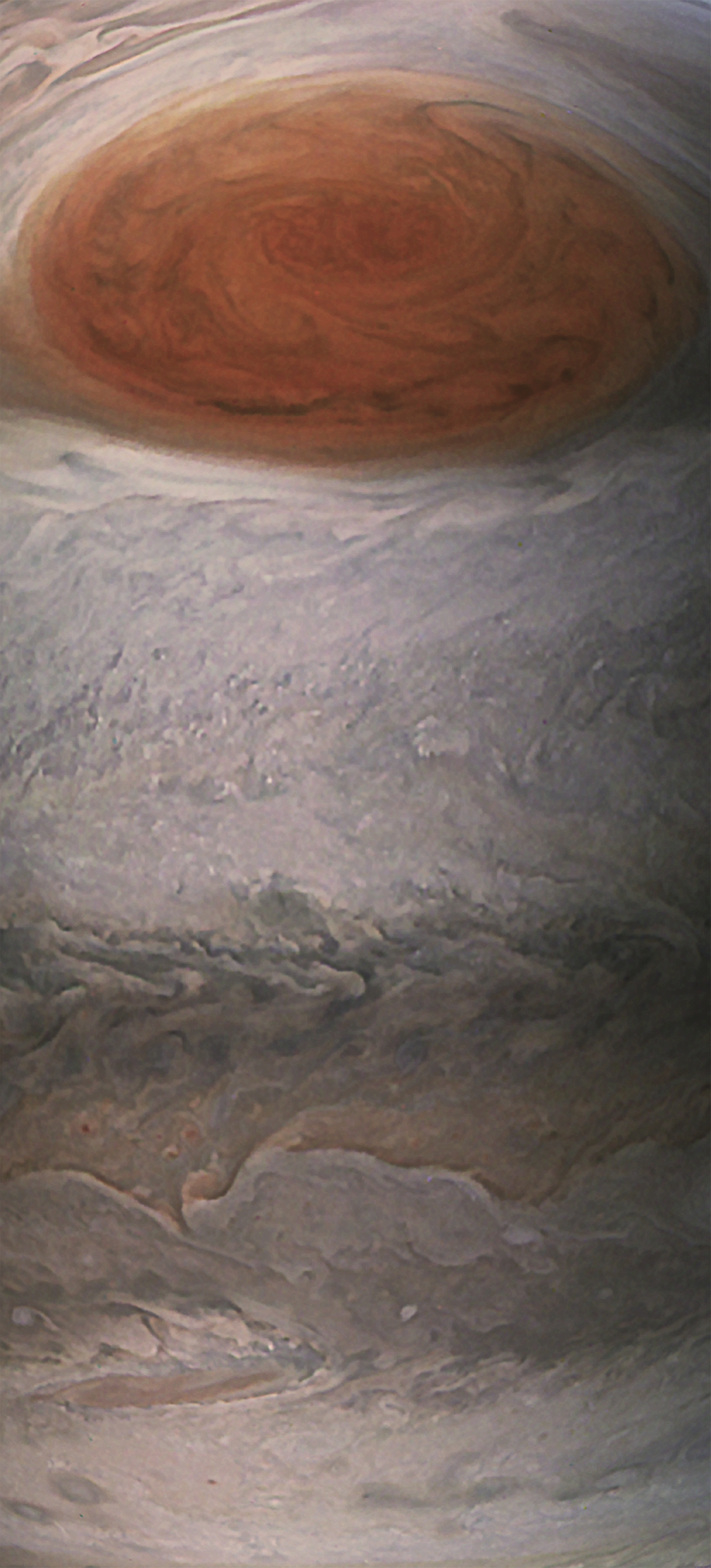Junocam pixels are 12 bits deep from the camera but are converted to 8 bits inside the instrument using a lossless "companding" table, a process similar to gamma correction, to reduce their size. All Junocam products on the missionjuno website are in this 8-bit form as received on Earth. Scientific users interested in radiometric analysis should use the "RDR" data products archived with the Planetary Data System, which have been converted back to a linear 12-bit scale.