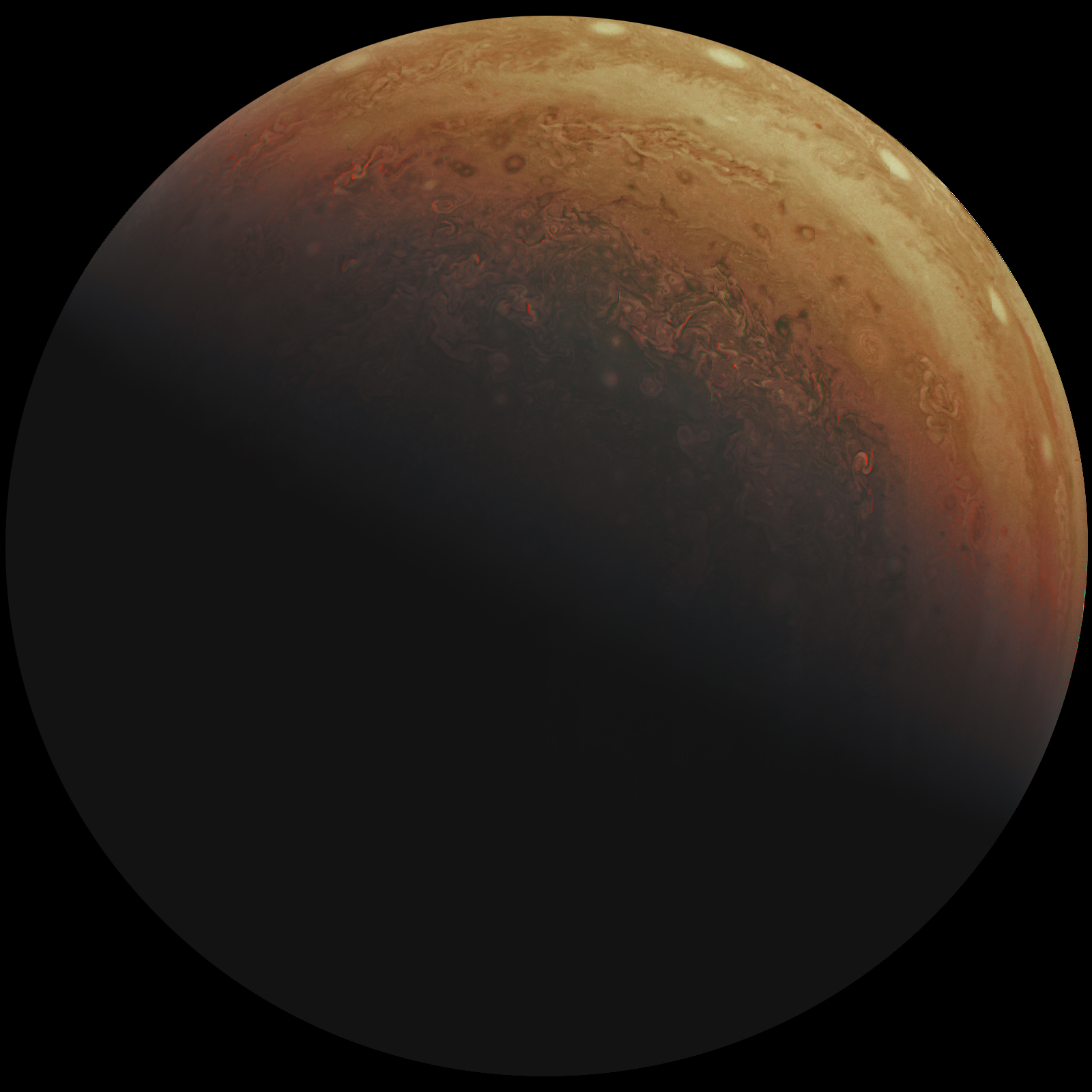 Junocam pixels are 12 bits deep from the camera but are converted to 8 bits inside the instrument using a lossless "companding" table, a process similar to gamma correction, to reduce their size. All Junocam products on the missionjuno website are in this 8-bit form as received on Earth. Scientific users interested in radiometric analysis should use the "RDR" data products archived with the Planetary Data System, which have been converted back to a linear 12-bit scale.