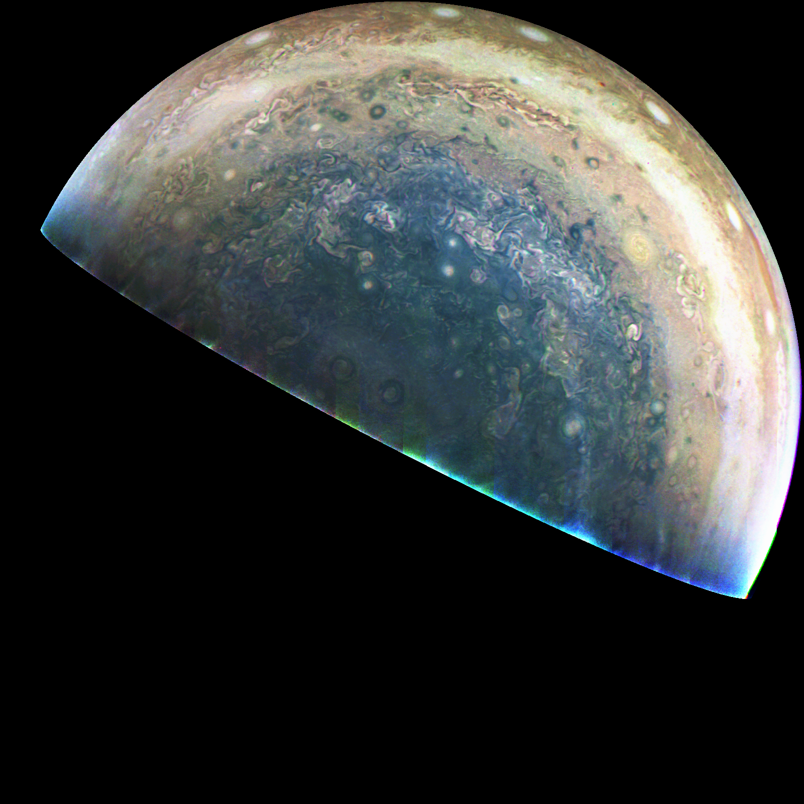 Junocam pixels are 12 bits deep from the camera but are converted to 8 bits inside the instrument using a lossless "companding" table, a process similar to gamma correction, to reduce their size. All Junocam products on the missionjuno website are in this 8-bit form as received on Earth. Scientific users interested in radiometric analysis should use the "RDR" data products archived with the Planetary Data System, which have been converted back to a linear 12-bit scale.