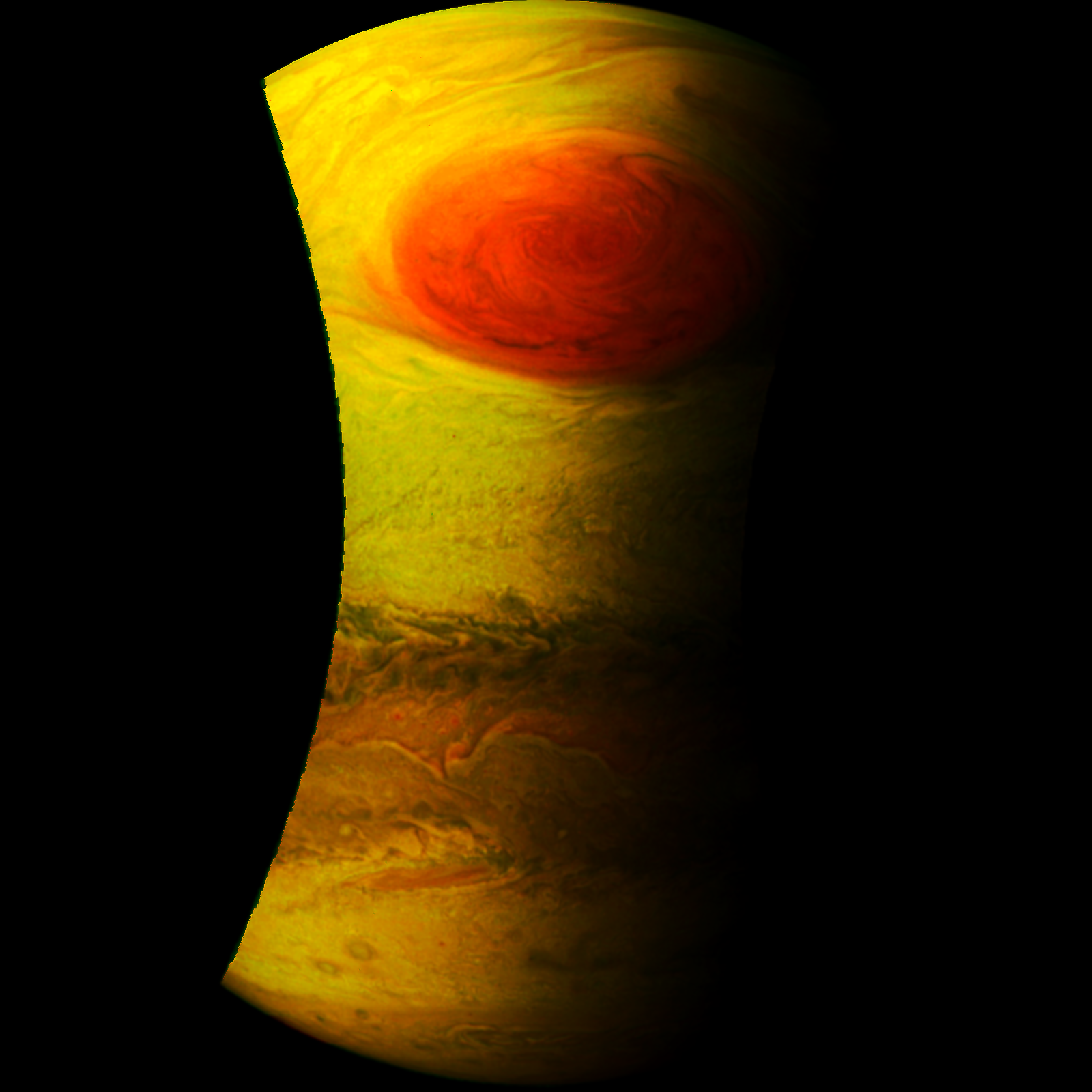 Junocam pixels are 12 bits deep from the camera but are converted to 8 bits inside the instrument using a lossless "companding" table, a process similar to gamma correction, to reduce their size. All Junocam products on the missionjuno website are in this 8-bit form as received on Earth. Scientific users interested in radiometric analysis should use the "RDR" data products archived with the Planetary Data System, which have been converted back to a linear 12-bit scale.