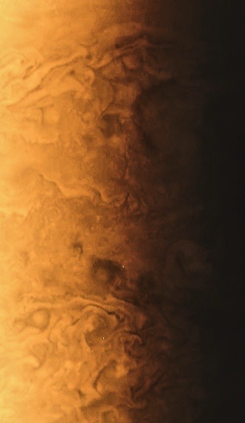 Junocam pixels are 12 bits deep from the camera but are converted to 8 bits inside the instrument using a lossless "companding" table, a process similar to gamma correction, to reduce their size. All Junocam products on the missionjuno website are in this 8-bit form as received on Earth. Scientific users interested in radiometric analysis should use the "RDR" data products archived with the Planetary Data System, which have been converted back to a linear 12-bit scale.