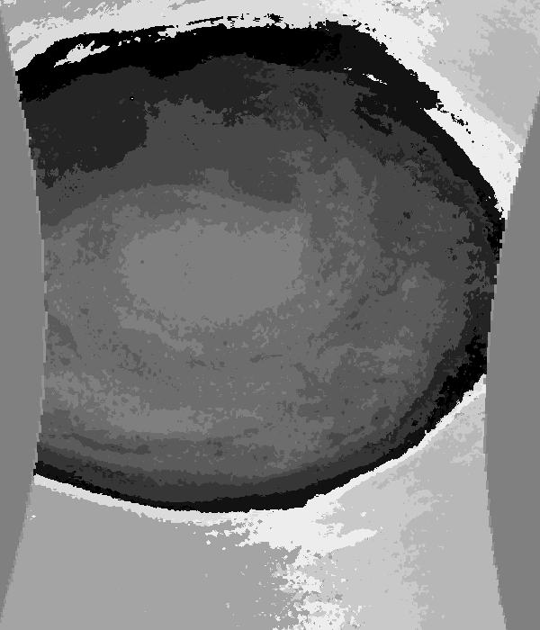 Junocam pixels are 12 bits deep from the camera but are converted to 8 bits inside the instrument using a lossless "companding" table, a process similar to gamma correction, to reduce their size. All Junocam products on the missionjuno website are in this 8-bit form as received on Earth. Scientific users interested in radiometric analysis should use the "RDR" data products archived with the Planetary Data System, which have been converted back to a linear 12-bit scale.