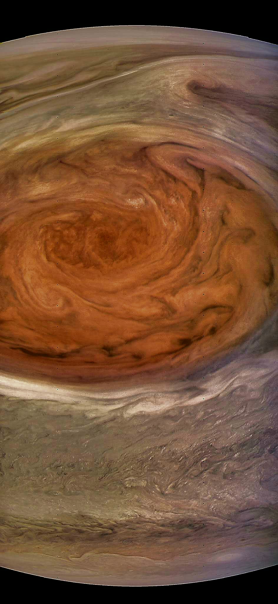Junocam pixels are 12 bits deep from the camera but are converted to 8 bits inside the instrument using a lossless "companding" table, a process similar to gamma correction, to reduce their size. All Junocam products on the missionjuno website are in this 8-bit form as received on Earth. Scientific users interested in radiometric analysis should use the "RDR" data products archived with the Planetary Data System, which have been converted back to a linear 12-bit scale.