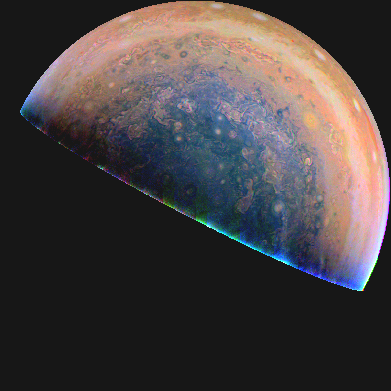 The South Pole at minimum emission angle. Again, I've only played with the saturation, brightness, sharpness and color curves to bring out the details in the region, and also hoping to show the stark contrast in the pole's bluish tint against the rest of the planet.