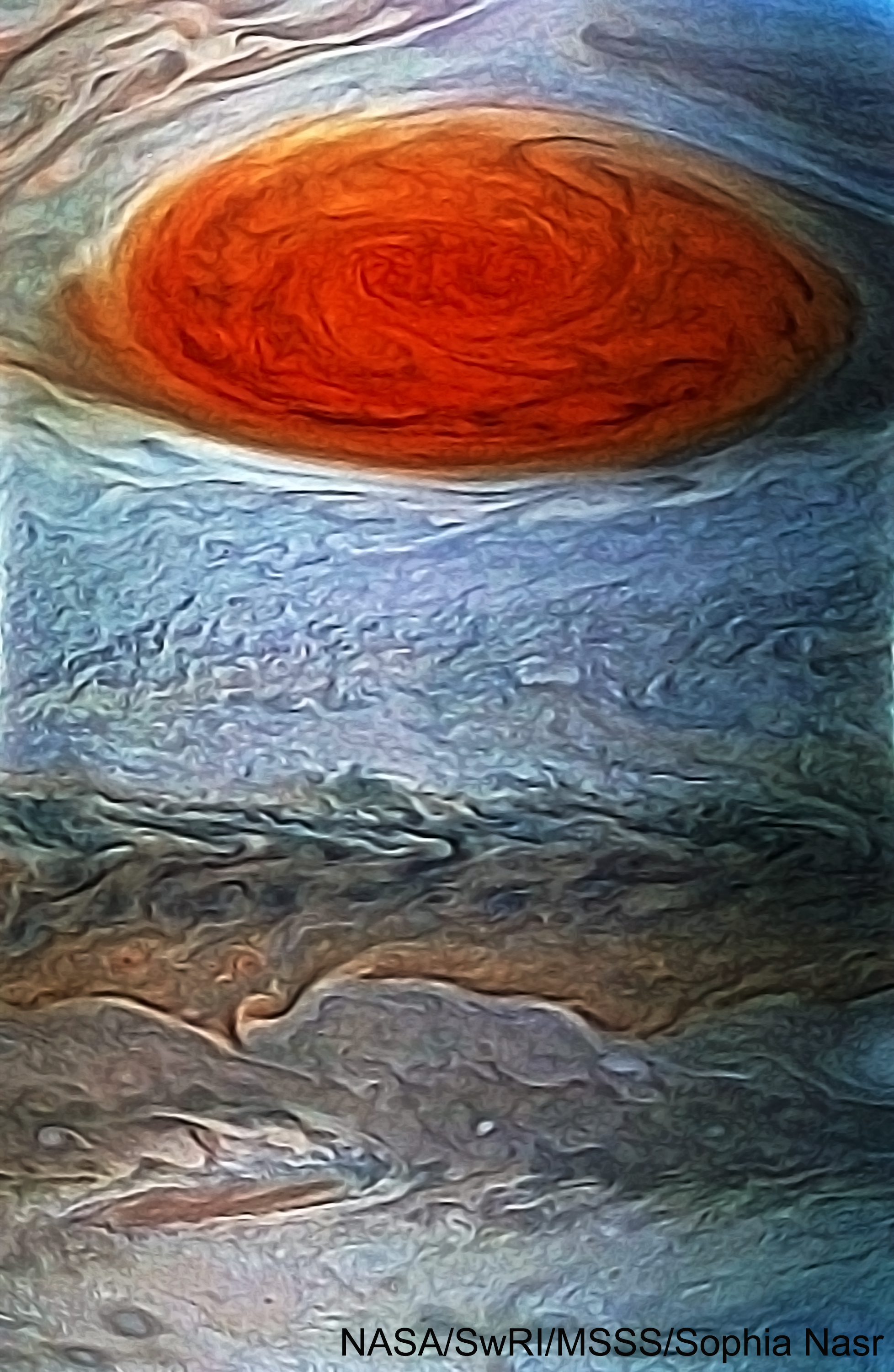 Processed image of Jupiter's Great Red Spot during its flyby this July 10, 2017.