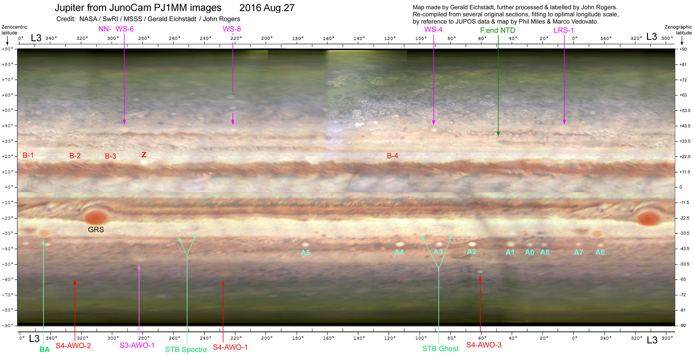 Map from JunoCam images, 2016 August 27, labelled