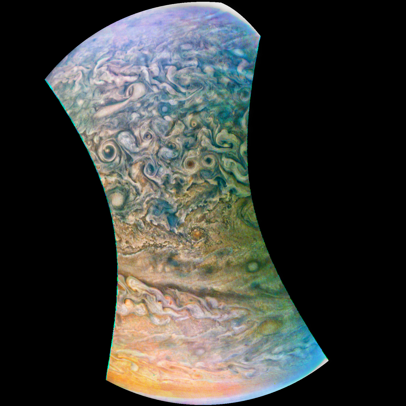 Junocam pixels are 12 bits deep from the camera but are converted to 8 bits inside the instrument using a lossless "companding" table, a process similar to gamma correction, to reduce their size. All Junocam products on the missionjuno website are in this 8-bit form as received on Earth. Scientific users interested in radiometric analysis should use the "RDR" data products archived with the Planetary Data System, which have been converted back to a linear 12-bit scale.