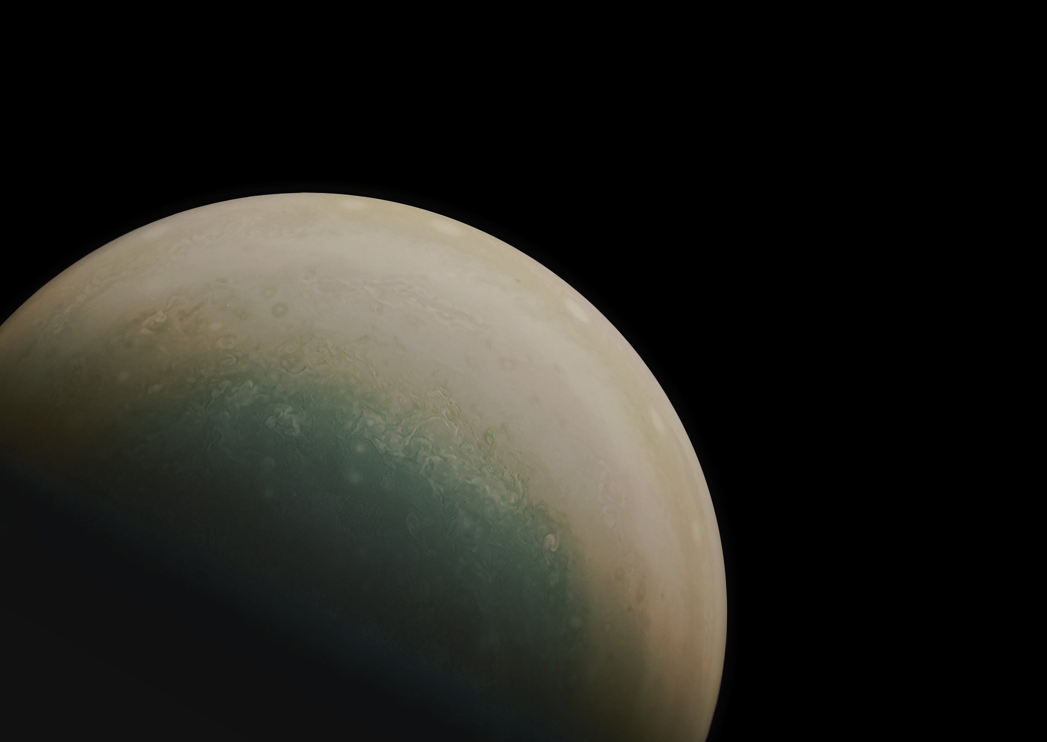 Processed JUNOCAM's image of the South Pole for approximate color and higher detail.
