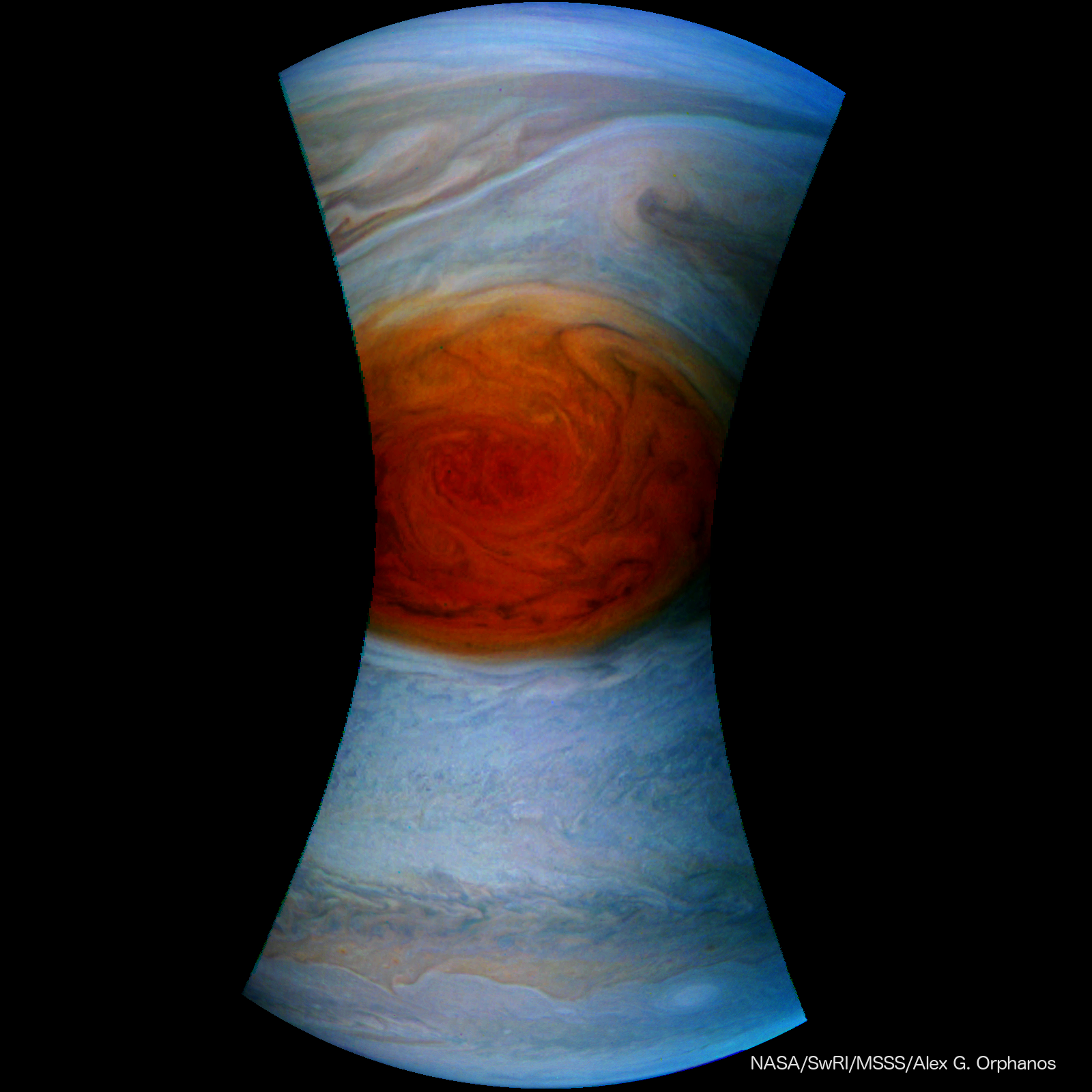 This is a post processed image by Alex G. Orphanos of Jupiter's Great Red Spot, a storm so large that you can fit Earth inside it comfortably. The image was taken originally by the JUNOCAM aboard the JUNO spacecraft on it's scientific orbit over Jupiter's iconic storm, the closest fly over to date.