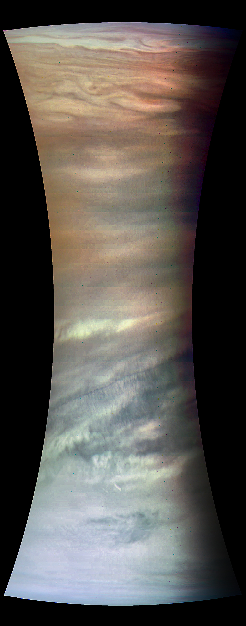 Junocam pixels are 12 bits deep from the camera but are converted to 8 bits inside the instrument using a lossless "companding" table, a process similar to gamma correction, to reduce their size. All Junocam products on the missionjuno website are in this 8-bit form as received on Earth. Scientific users interested in radiometric analysis should use the "RDR" data products archived with the Planetary Data System, which have been converted back to a linear 12-bit scale.