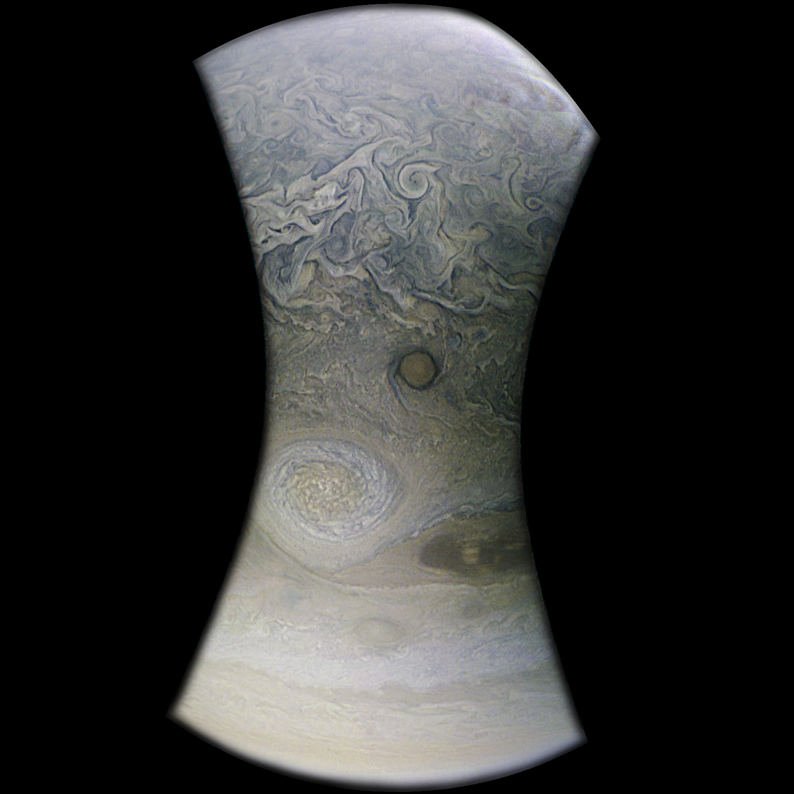 Junocam pixels are 12 bits deep from the camera but are converted to 8 bits inside the instrument using a lossless "companding" table, a process similar to gamma correction, to reduce their size. All Junocam products on the missionjuno website are in this 8-bit form as received on Earth. Scientific users interested in radiometric analysis should use the "RDR" data products archived with the Planetary Data System, which have been converted back to a linear 12-bit scale.