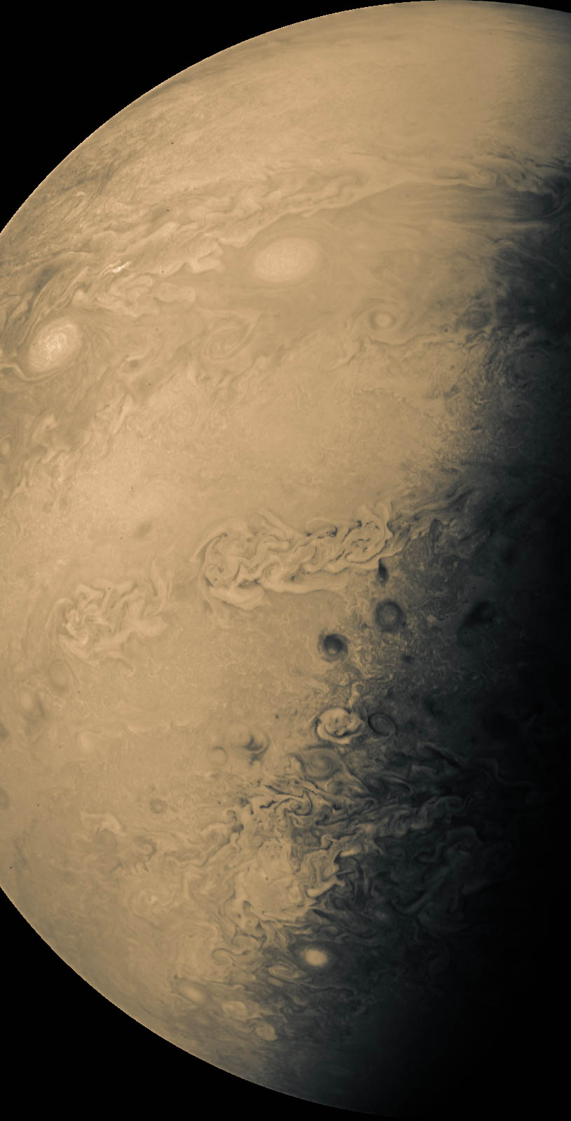 Junocam pixels are 12 bits deep from the camera but are converted to 8 bits inside the instrument using a lossless "companding" table, a process similar to gamma correction, to reduce their size. All Junocam products on the missionjuno website are in this 8-bit form as received on Earth. Scientific users interested in radiometric analysis should use the "RDR" data products archived with the Planetary Data System, which have been converted back to a linear 12-bit scale.